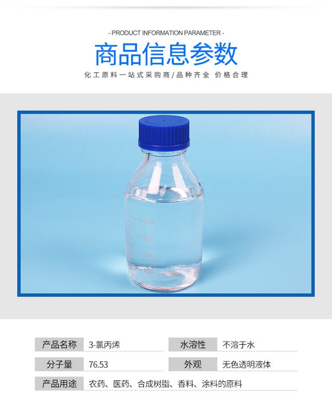 2.兼有烯烴和鹵代烴的反應(yīng)性,是甘油、環(huán)氧氯丙烷、丙烯醇等的有機(jī)合成中間體。也用于農(nóng)藥、醫(yī)藥的原料。還可用作合成樹(shù)脂、涂料、粘結(jié)劑、增塑劑、穩(wěn)定劑、表面活性劑、潤(rùn)滑劑、土壤改良劑、香料等精細(xì)化學(xué)品的原料,主要用于制造環(huán)氧氯丙烷、甘油、氯丙醇、丙烯醇、農(nóng)藥殺蟲(chóng)雙、醫(yī)藥、樹(shù)脂、涂料、粘合劑,以及丙烯磺酸鈉,潤(rùn)滑劑等。